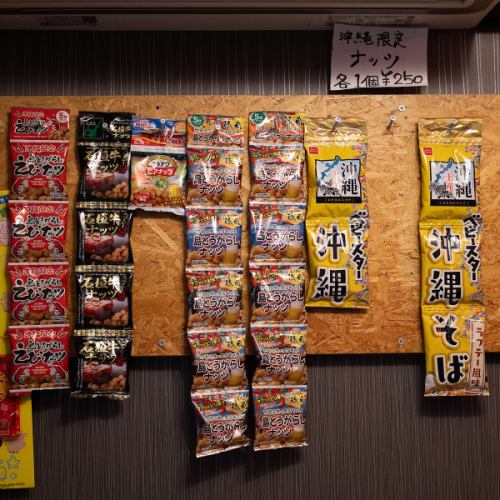 店内では沖縄のお土産菓子やスナックも販売中。泡盛や沖縄料理と一緒に楽しめば、まるで沖縄旅行気分♪1個ずつの販売なので、色々な種類を楽しめます!沖縄好きにはたまらない、ワクワクする空間です!
